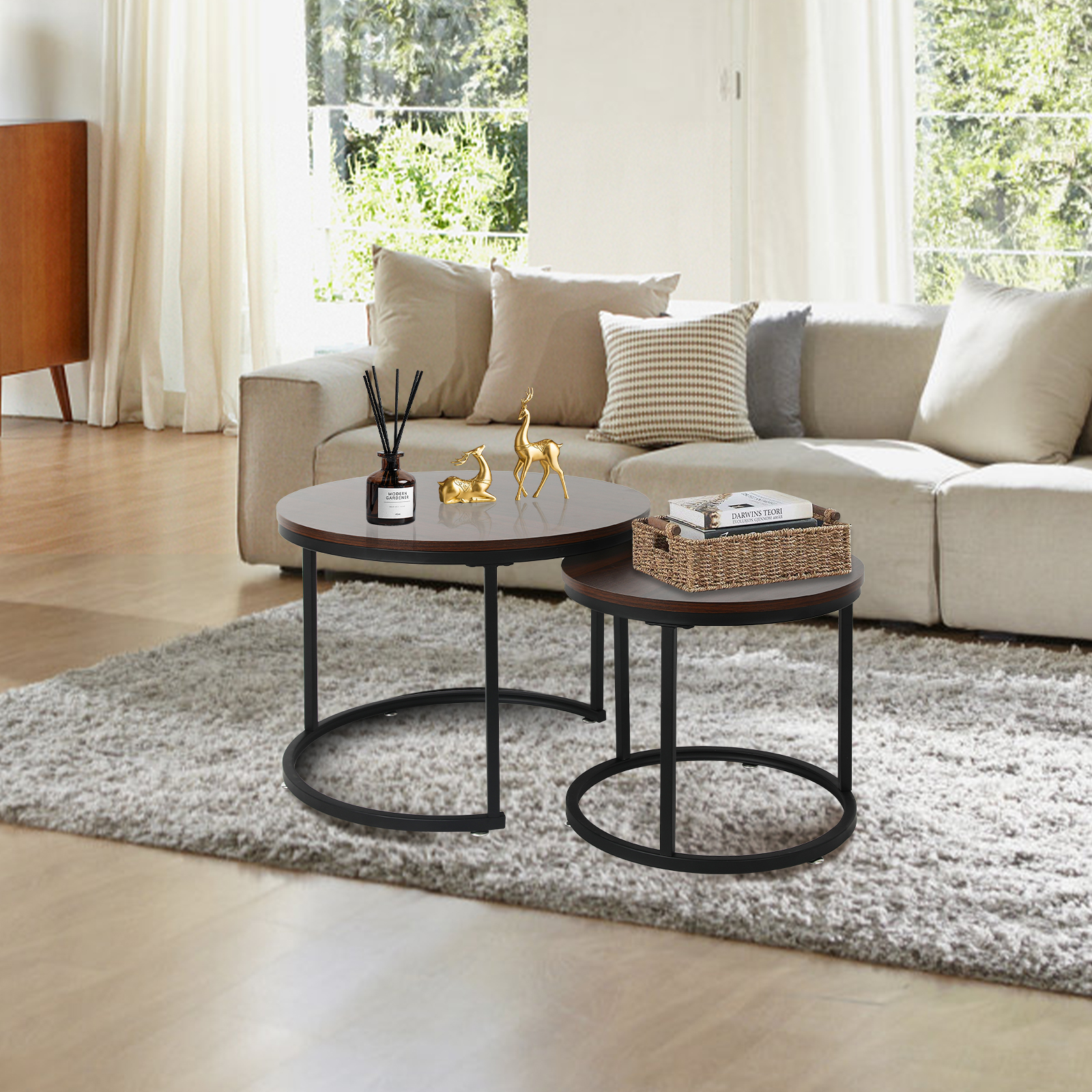 Fionafurn 23.6" Round Nesting Coffee Table, Solid Wood End Table For Living Room Patio Garden Balcony Yard Porch,Brown