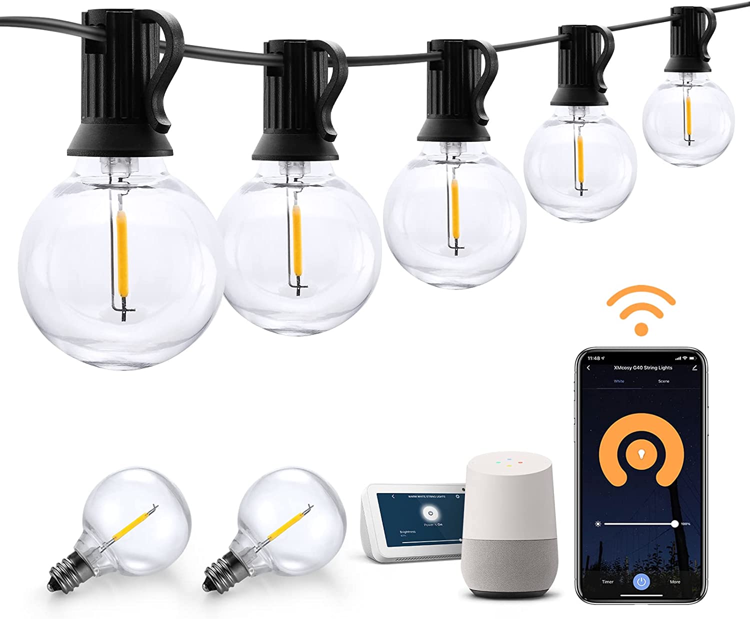 100Ft, G40 Globe Patio Lights with 50 Dimmable LED Bulbs, APP Control
