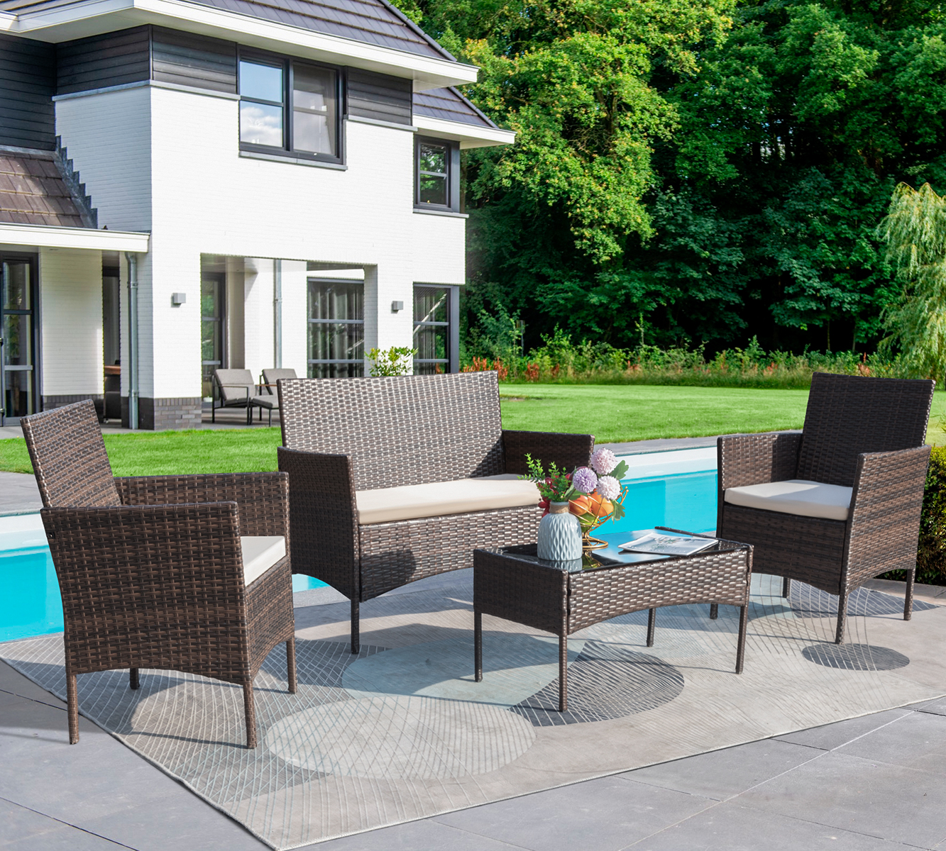 Lacoo 4 - Piece Outdoor Patio Conversation Furniture Sets with Cushioned Tempered Glass, Conversation Sets, 4, Metal