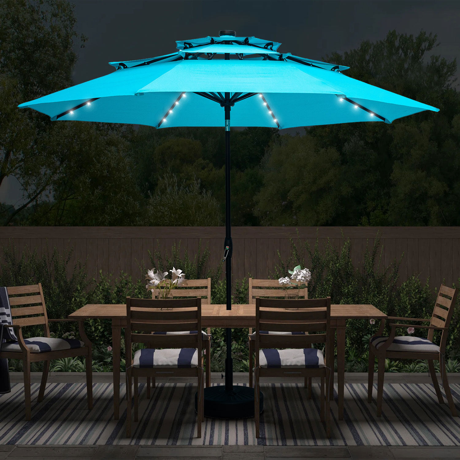 Autlaycil 10Ft 3 Tiers Market Umbrella Solar 32 LED Lighted Umbrella with 8 Ribs Patio Table Umbrella with Base/Stand, Blue
