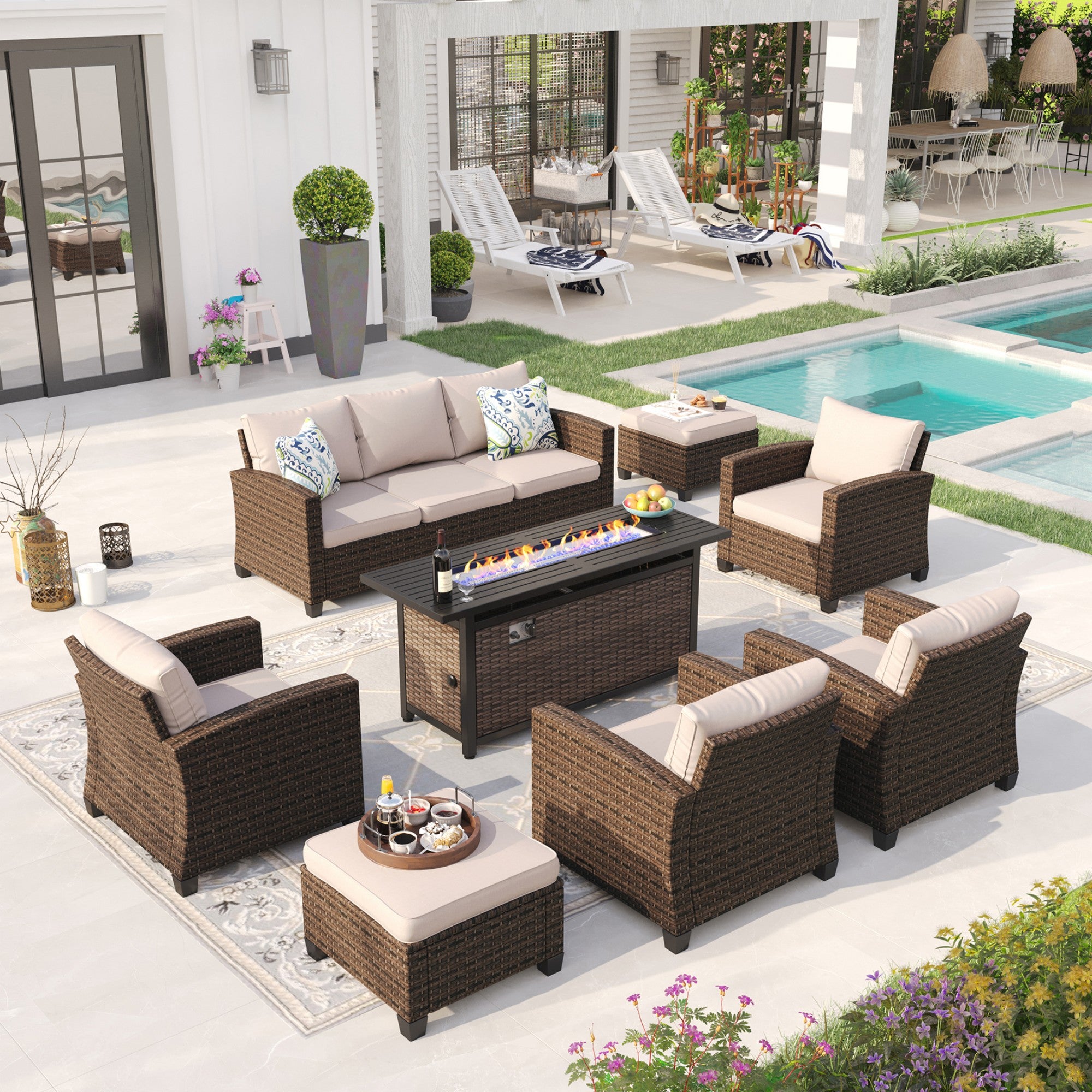 Sophia & William 8 Pieces Wicker Patio Conversation Set with Fire Pit Table, Beige