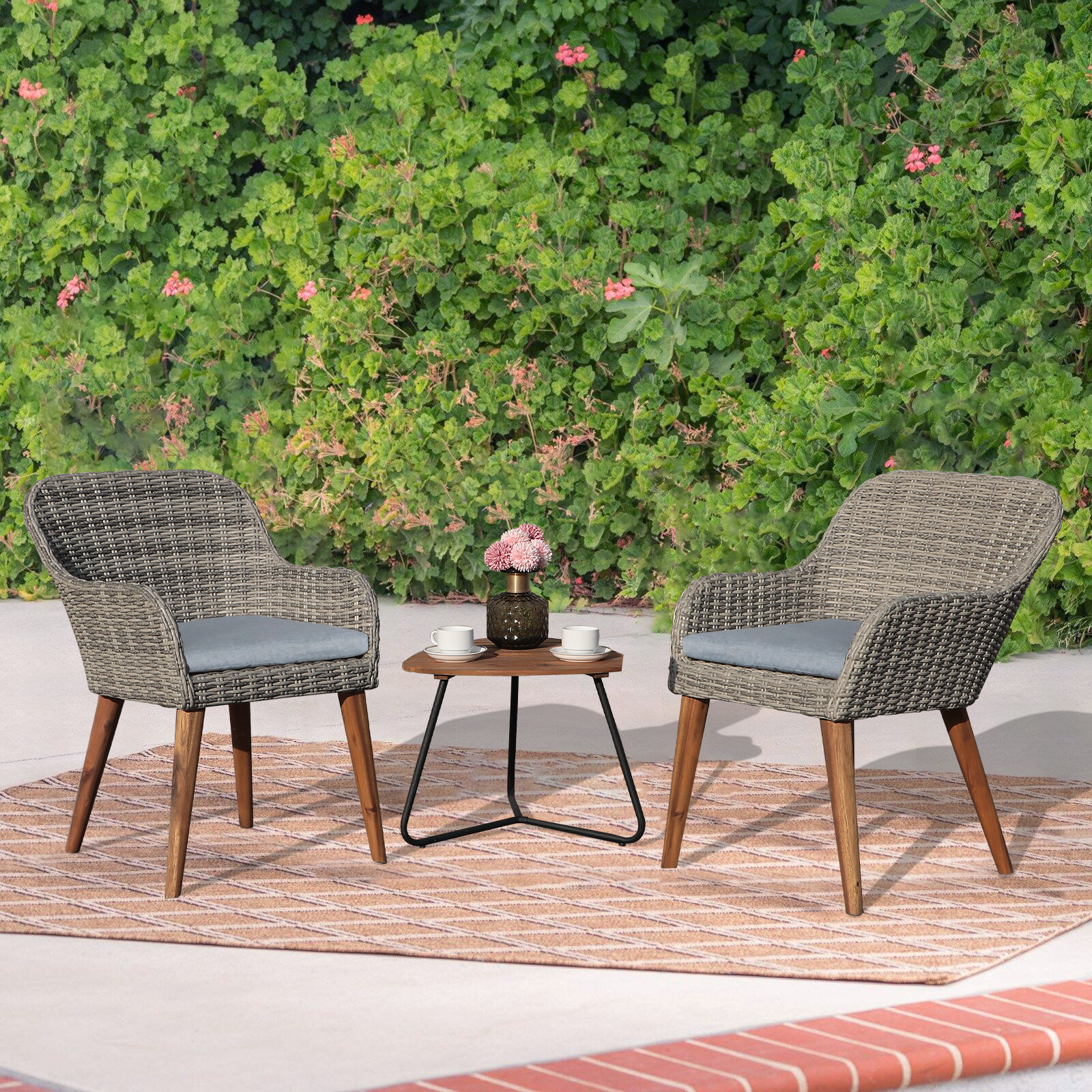 3-Piece Outdoor Bistro Set, Weather-resistant PE Wicker Patio Conversation Set with Cushion, Wood Top Side Table, Gray Wicker with Wood Leg