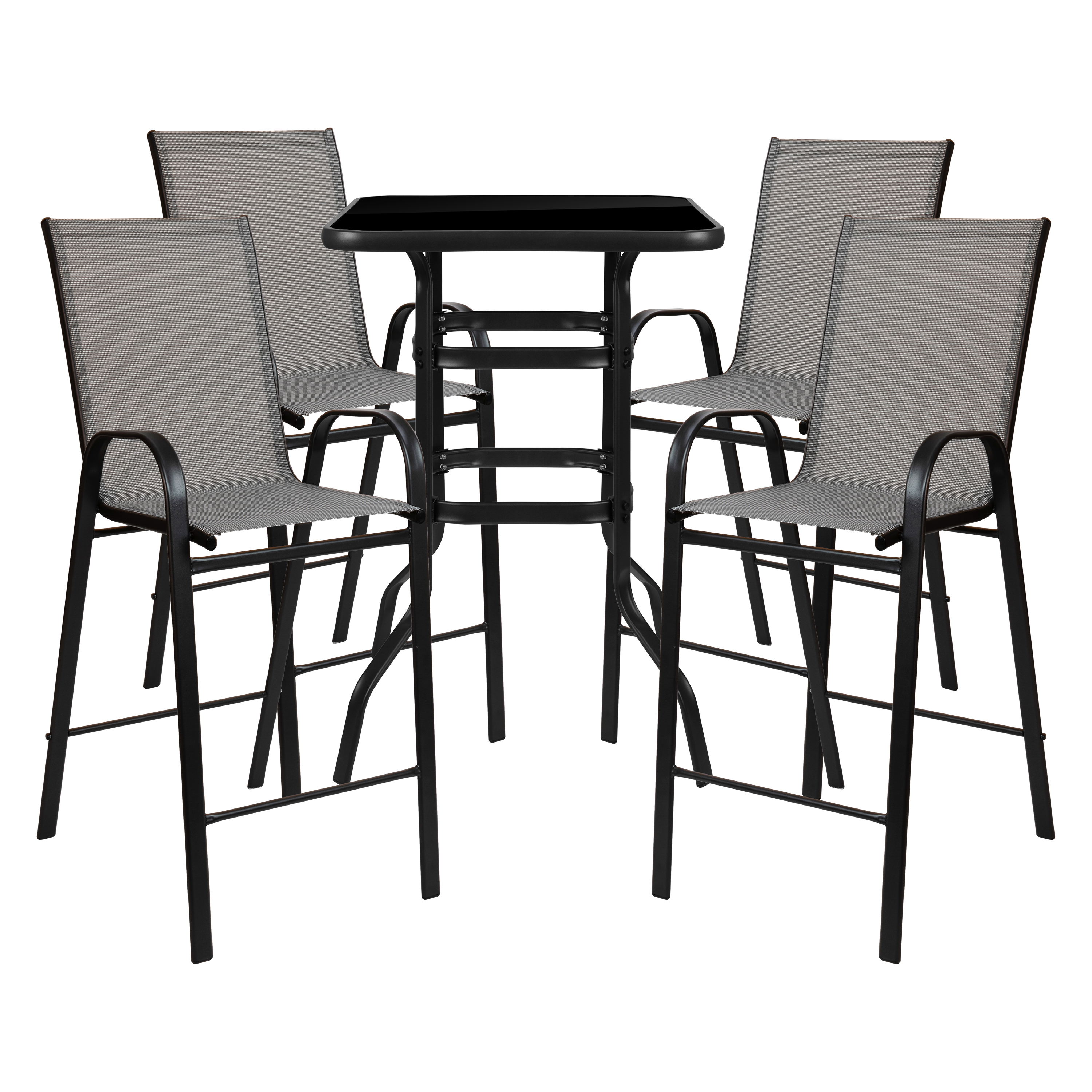 Flash Furniture Brazos Outdoor Dining Set - 4-Person Bistro Set - Brazos Outdoor Glass Bar Table with Gray All-Weather Patio Stools