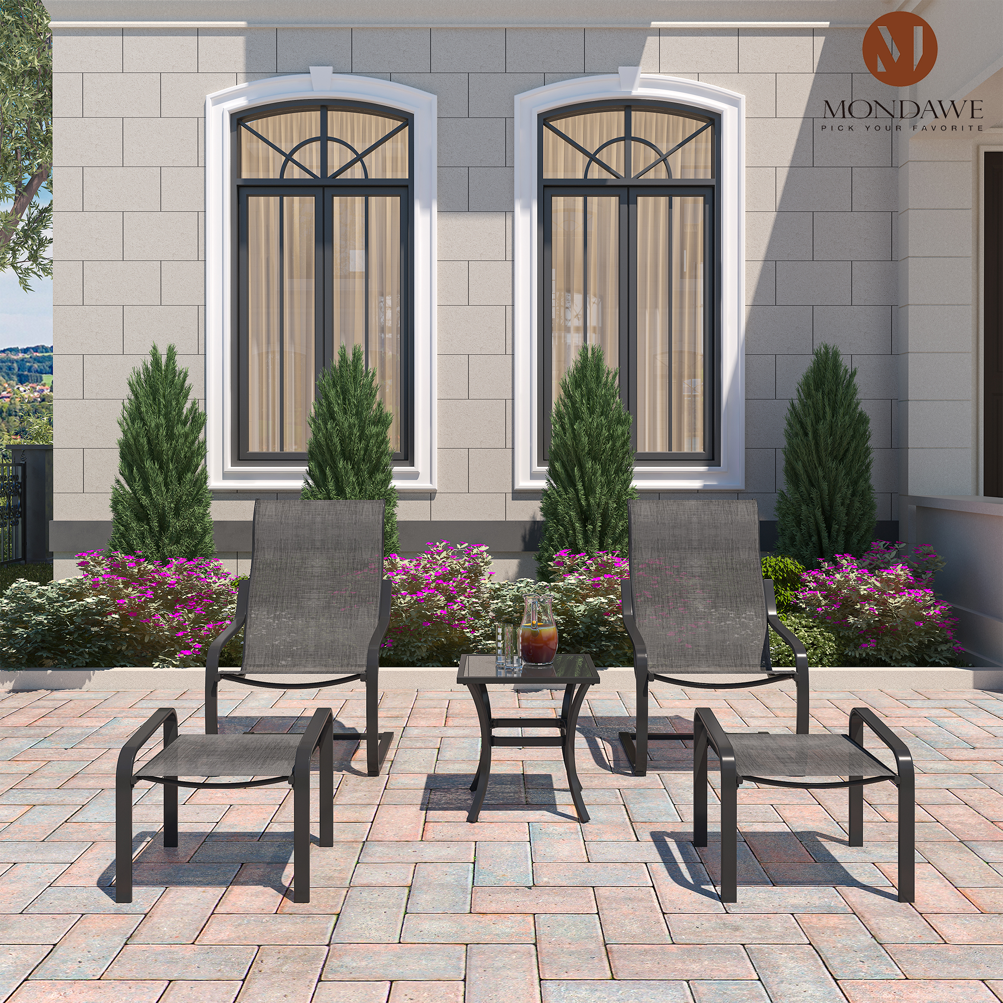 Mondawe Outdoor All-Weather 5 Pieces Textilene Conversation Set, Patio Bistro Set with Footstool for Lawn Garden Backyard Pool