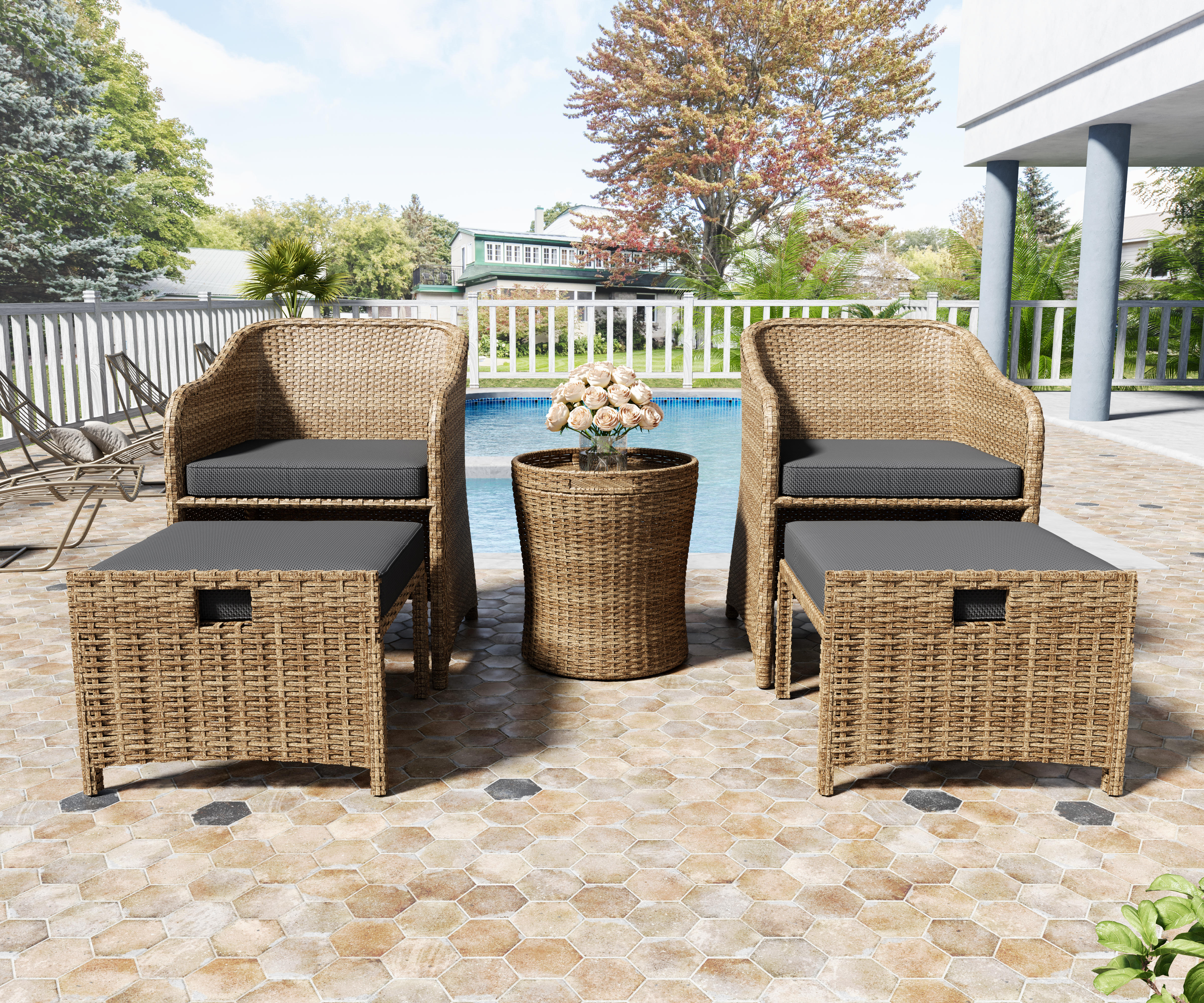 Esmlada Outdoor Patio Wicker 5-Piece Furniture Set, No Assembly Required All-Weather Rattan Conversation Bistro & Storage Table for Garden, Porch, Balcony and Deck (Black)