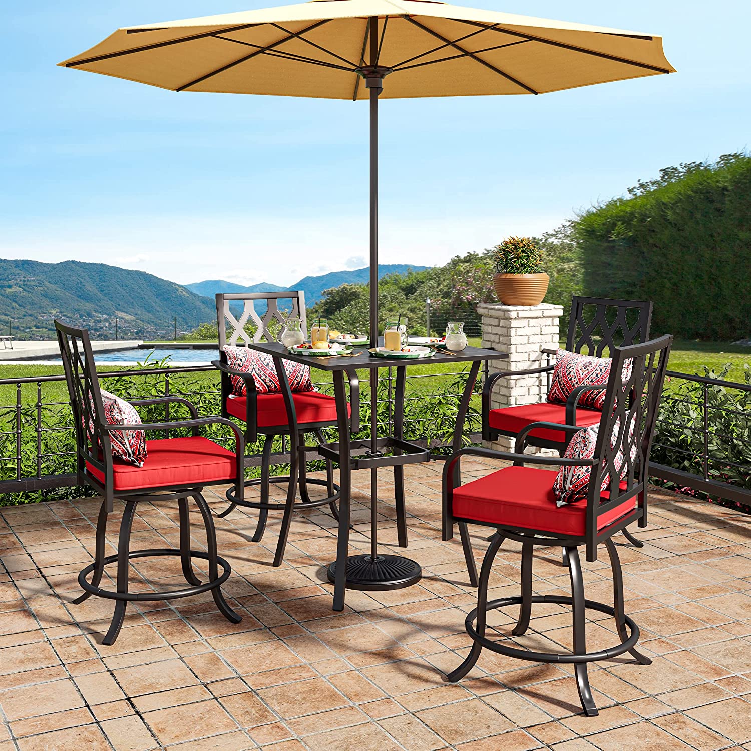 DWVO 5-Piece Patio Swivel Bar Set, 32" Square Patio Bar Table (Umbrella Hole) and 4 Cushioned Swivel Bar Stools, Metal Patio Bar Set Ideal for Patio Lawn Garden Porch, Black
