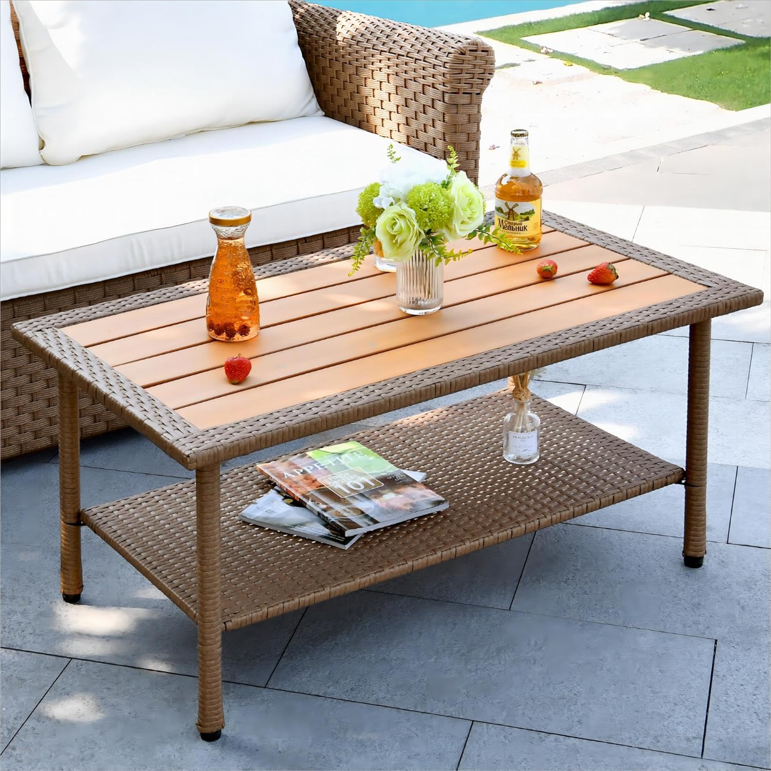 Outdoor Wicker Coffee Table With 2-Layer, 39.4" Rectangle Outside Side Table With Faux Wood Top, All-Weather Rattan Patio Bistro Table For Garden Backyard Porch - Brown