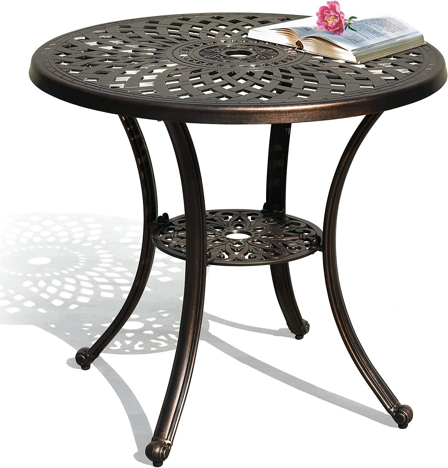 30 Inches Round Patio Dining Table with Umbrella Hole, Antique Cast Aluminum Outdoor Bistro Table Outdoor Side Table for Backyard, Garden, Patio, Porch, Hammered Bronze