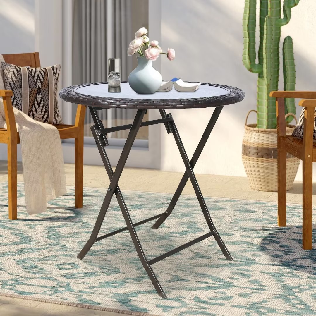 Iwicker Patio Rattan Folding Bistro Side Table Tempered Glass Table Coffee Table