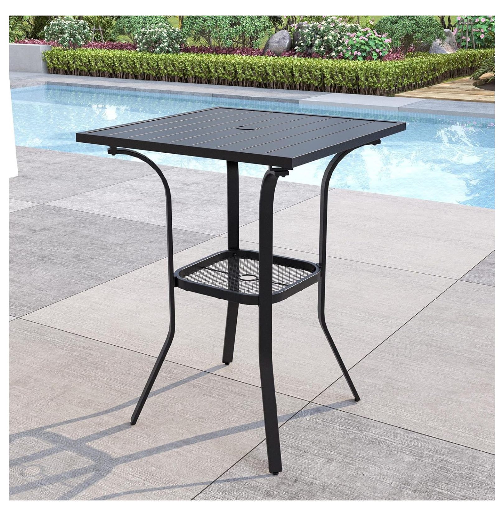 SUNCROWN 27.5" Patio High Top Bistro Pub Table Outdoor Black Square Metal Steel Slat Table with Umbrella Hole