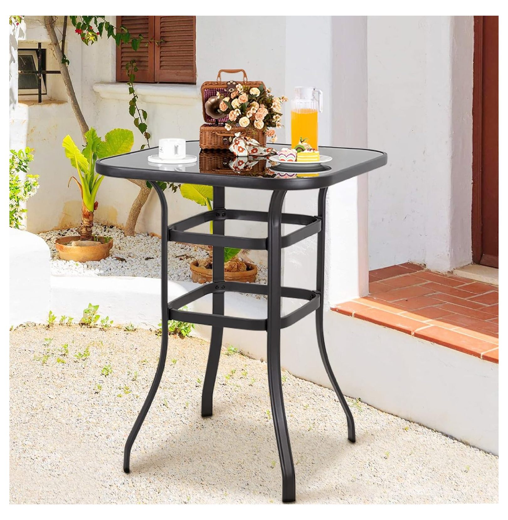 Bomrokson 40" Bar Height Outdoor Patio Bistro Table Metal Square Side Table Tempered Glass Top All Weather (31.5"x 31.5"x 41.2"H)