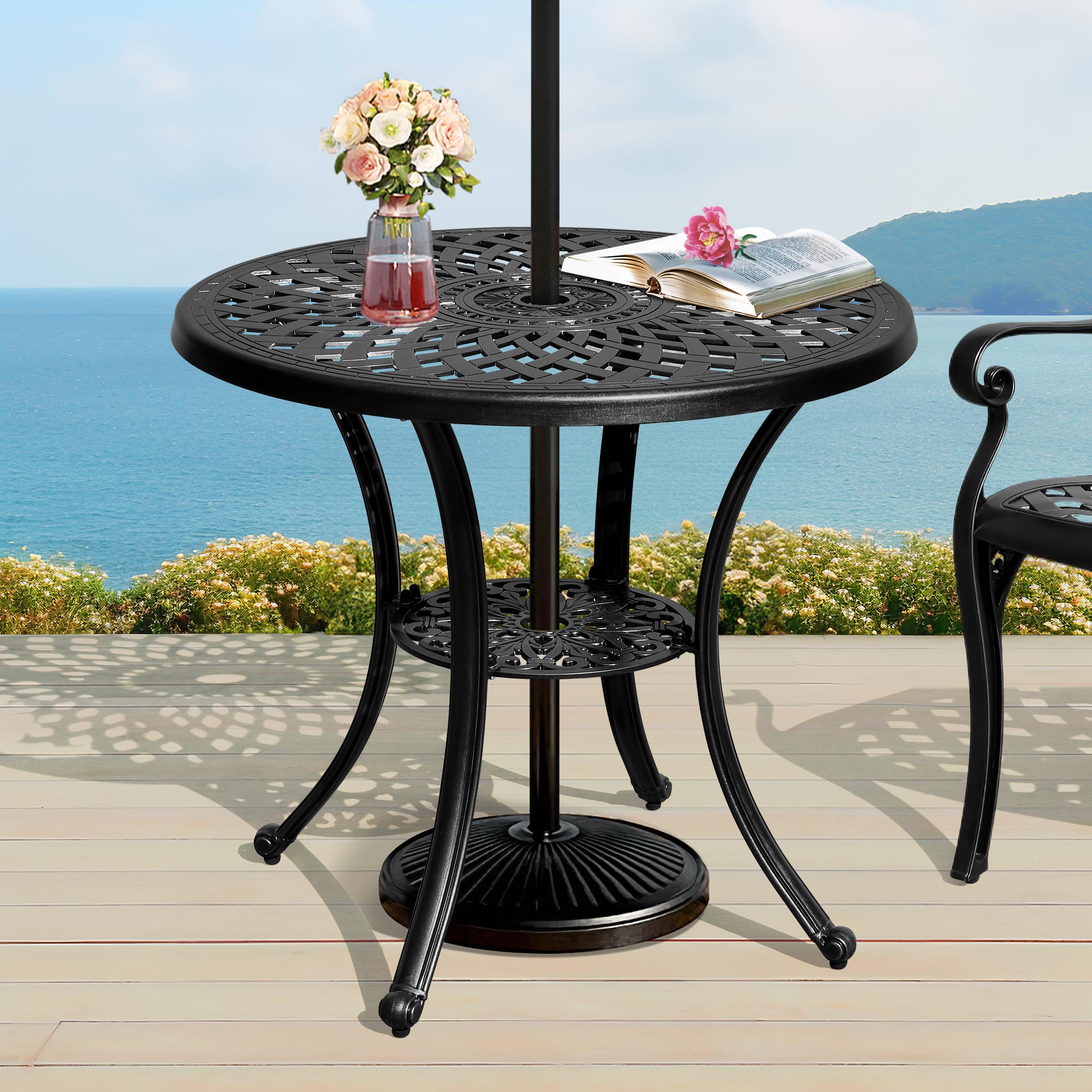 Dextrus 30in Patio Retro Round Cast Aluminum Dining Table with Umbrella Hole, Outdoor Bistro Table Side Table - Black