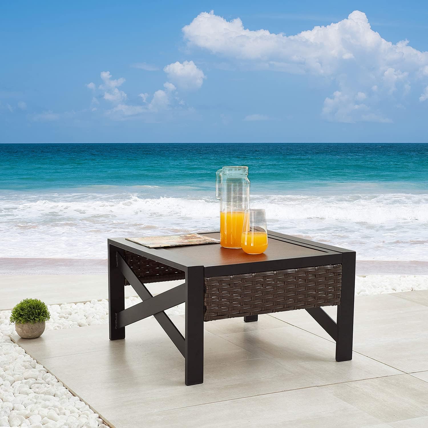 Patio Side Coffee Table Outdoor Bistro Dining Furniture With Wood Grain , Wicker Rattan And X Shaped Slatted Steel Legs (Brown)
