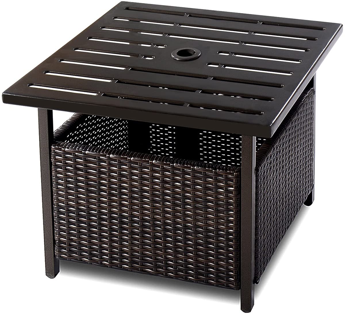 Outdoor Side Table with Umbrella Hole, Rattan/Wicker Umbrella Stand Table, Steel Metal Patio Bistro Table for Outdoor Deck Garden Pool, Brown
