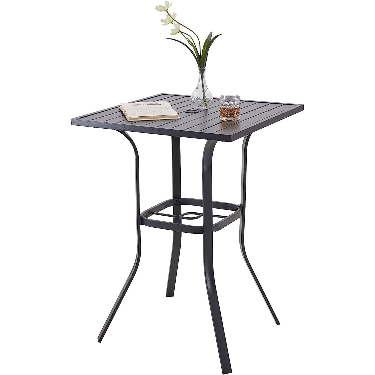 Patio Bar Height Table, Outdoor Square Bistro Table with Umbrella Hole, Metal Frame and Slat Design, Ideal for Patio Lawn Backyard Porch, Black
