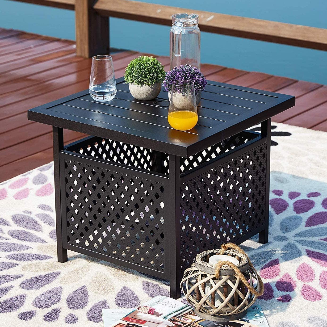 Outdoor Square Side Table Black Metal Frame Tables Patio Dining Bistro Table with Umbrella Hole Deck Garden Pool Furniture (22'' x 22")