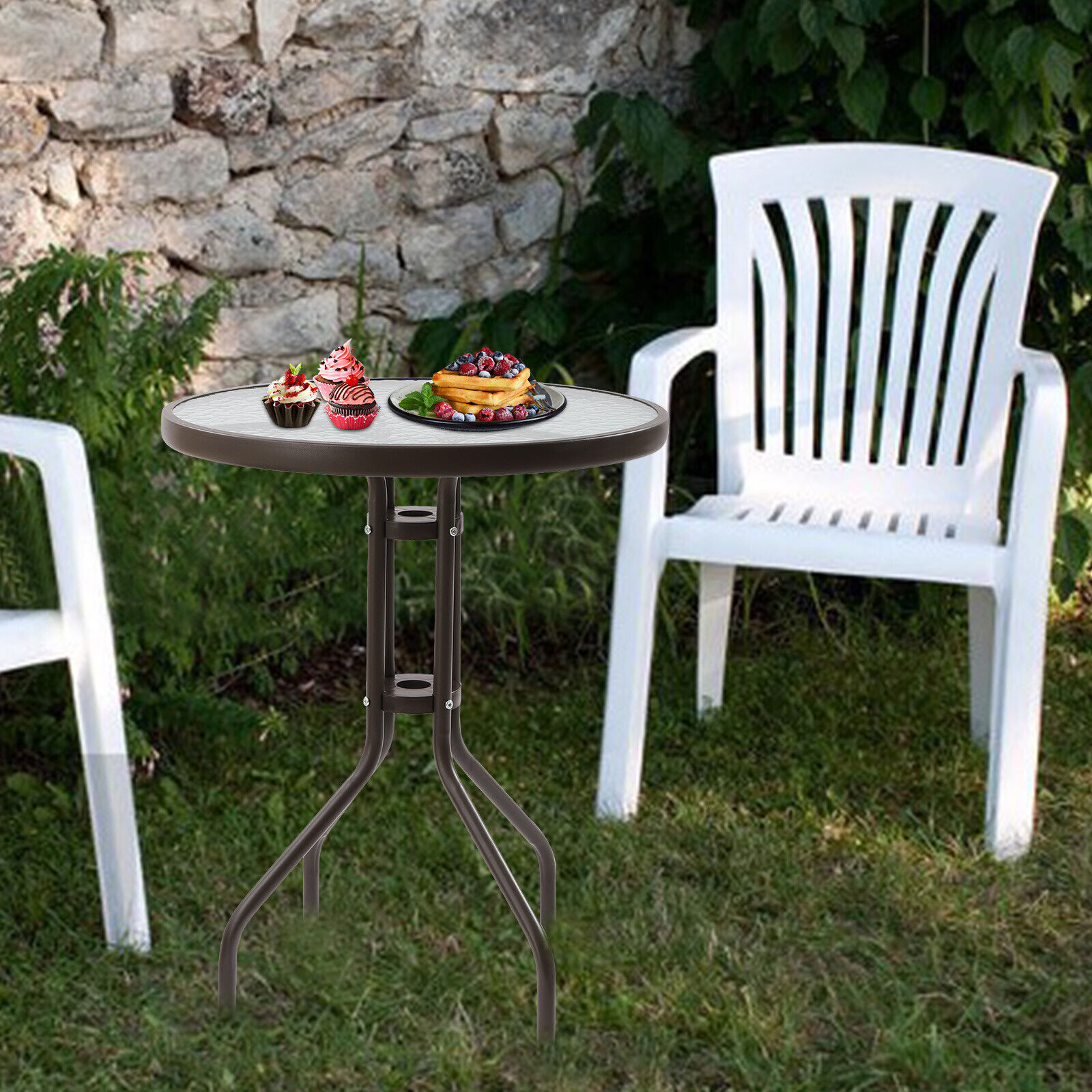Patio Round Coffee Tea Bistro Table Outdoor Furniture Tempered Glass Top 24 inch