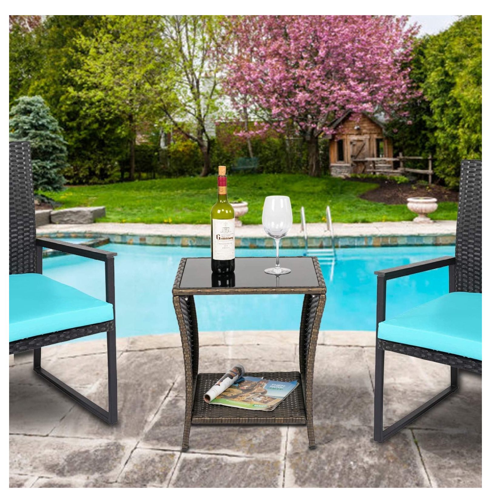 MYXIO Patio Wicker Bistro Table Rattan Square Outdoor Furniture Woven Desk Side with Black Glass Top, Dark Blonde