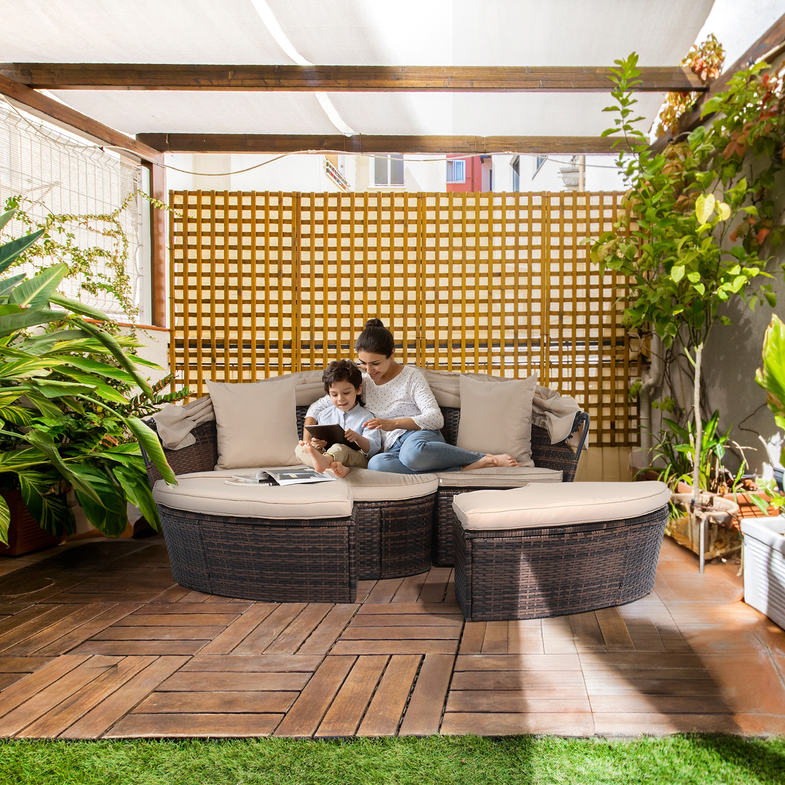 Ktaxon 5-Piece Patio Wicker Daybed, Wicker Sectional Sunbed Set with Retractable Canopy & Weather-Resistant Cushions for Porch Backyard Poolside, Brown