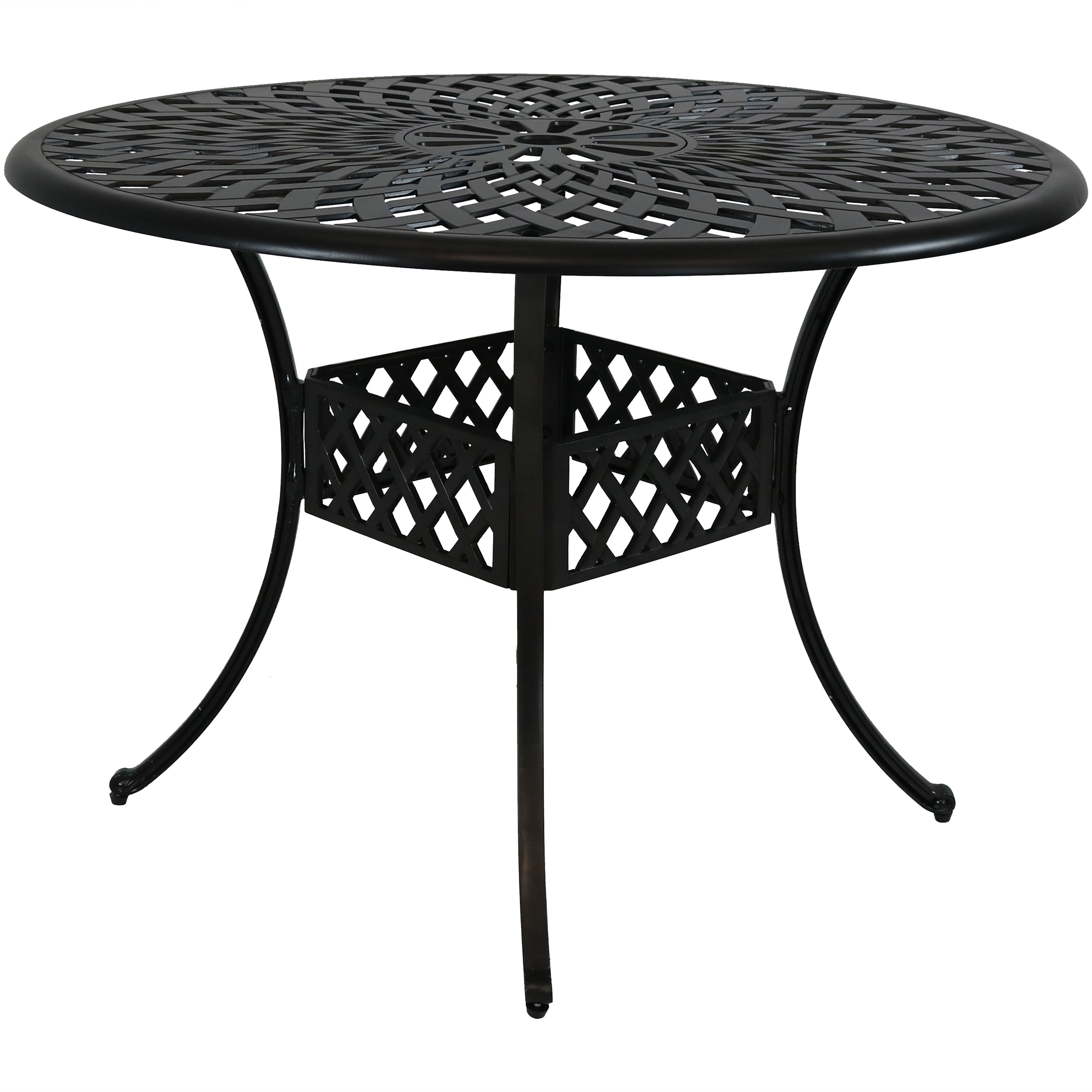 Sunnydaze Outdoor Crossweave Design Black Cast Aluminum Round Patio Dining Table with Umbrella Hole