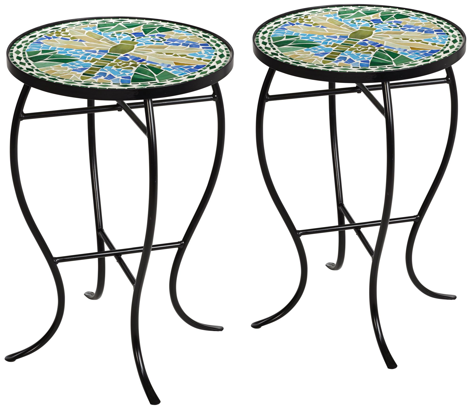 Teal Island Designs Black Round Outdoor Accent Side Tables 14" Wide Set of 2 Green Dragonfly Tabletop for Front Porch Patio Home House