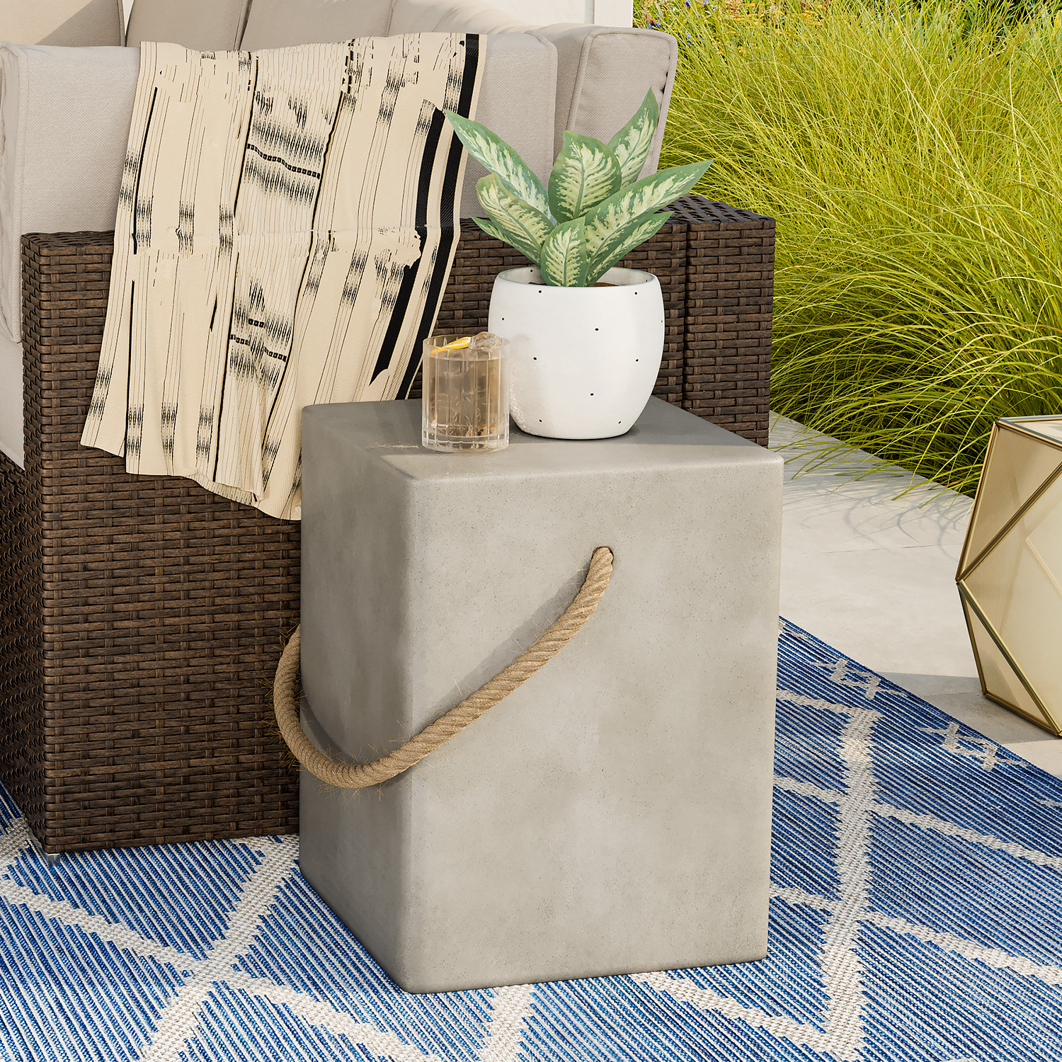 COSIEST Outdoor Rectangular Shaped MgO Patio End Table with Hemp Rope Handle
