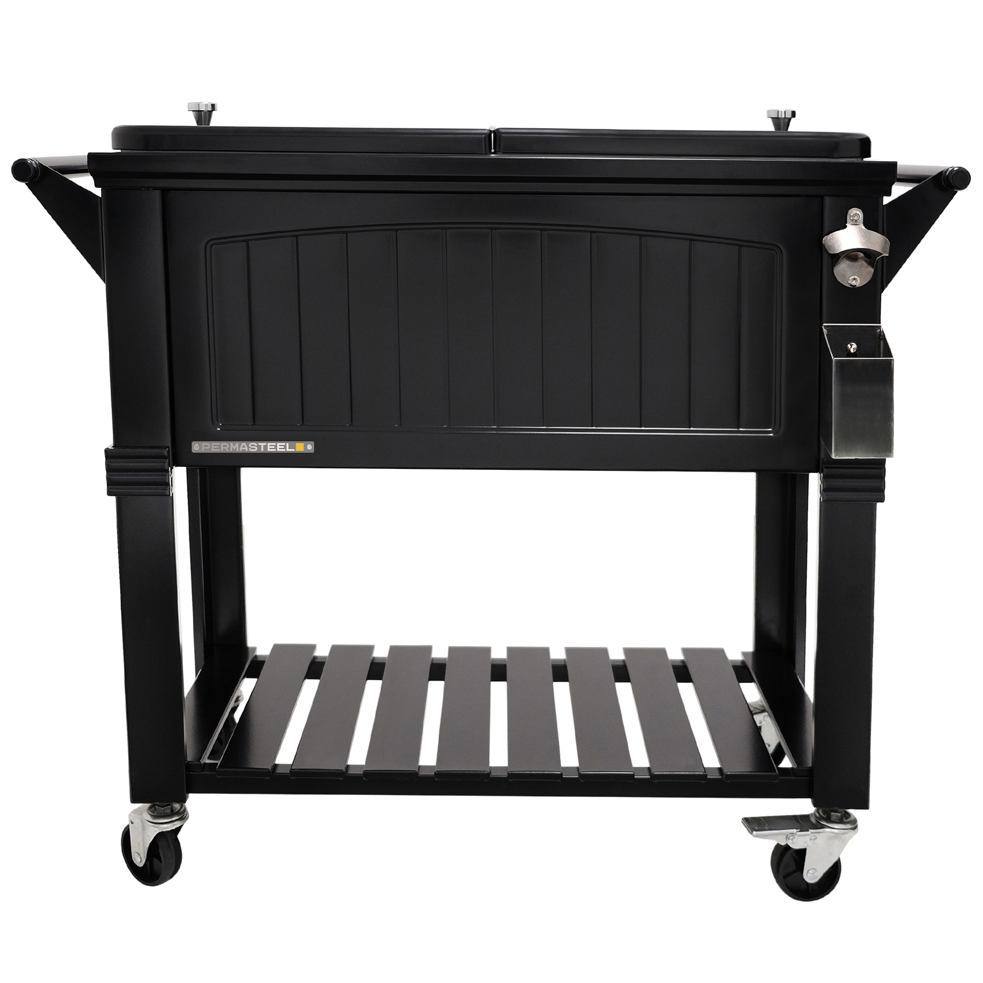 Permasteel 80-Qt Antique Outdoor Steel Patio Cooler on Wheels, Rolling Cooler Cart, Wooden Teak Style, Black