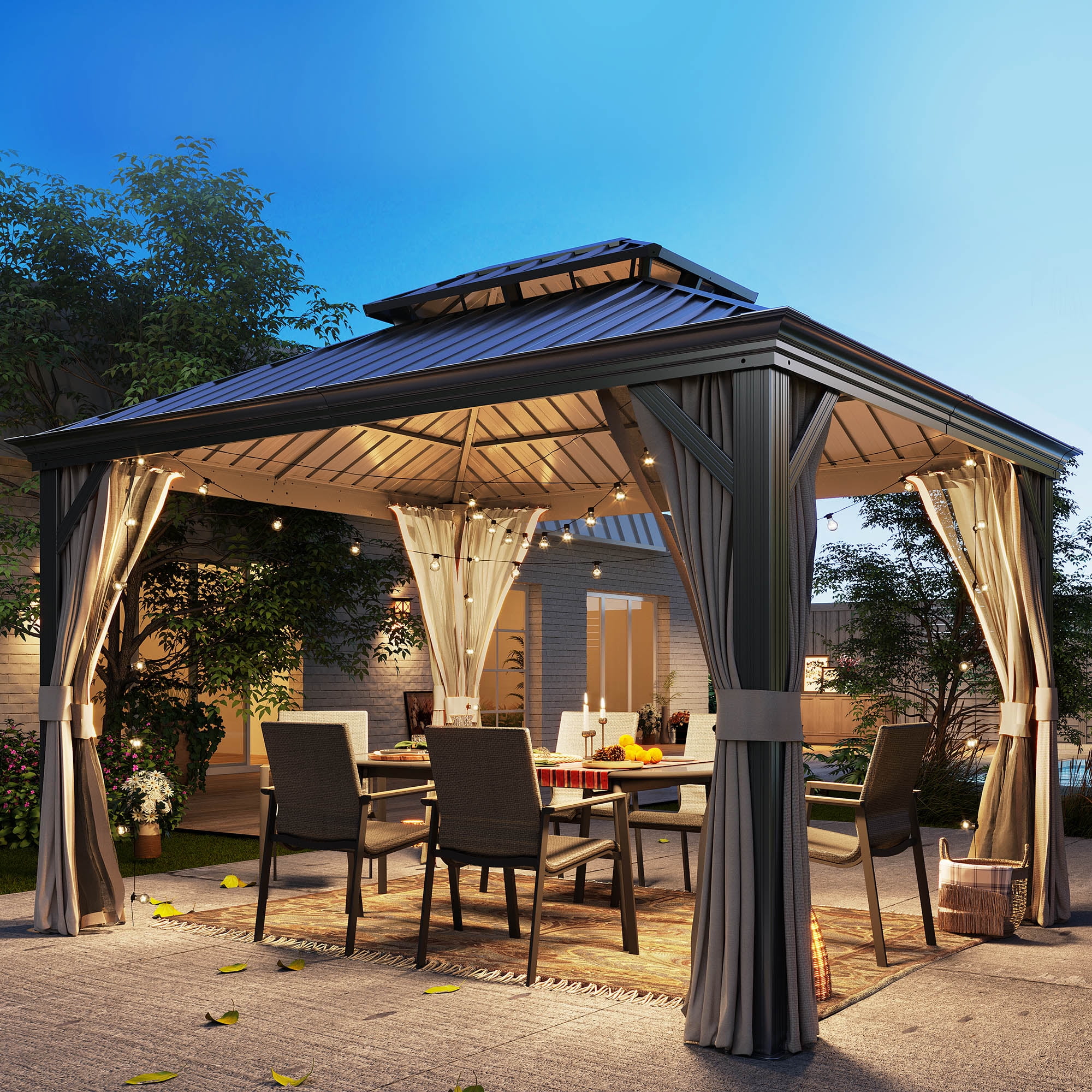 LAUSAINT HOME 10' x 12' Hardtop Patio Gazebo, 2-Tier Permanent Aluminum Hardtop with Mosquito Net and Privacy Curtain