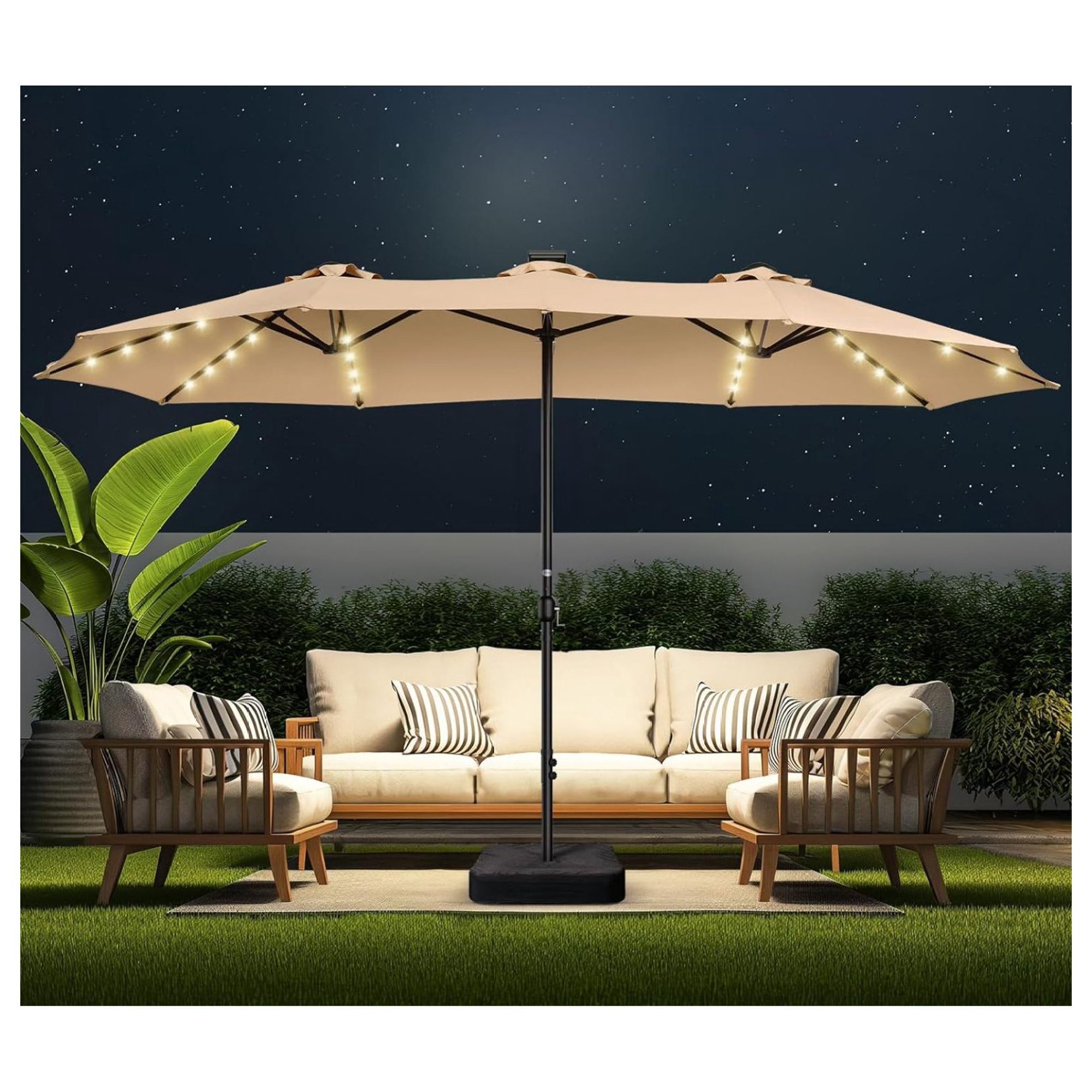 Lorelia Double Sided Patio Umbrellas - 15ft Solar Lights LED Lighted Outdoor Extra Large Market Table Umbrella with Base Included, Oversized Umbrella for Deck, Pool, Backyard (Beige)