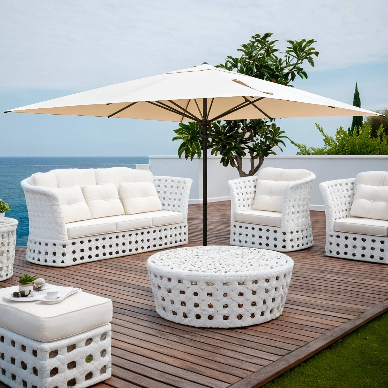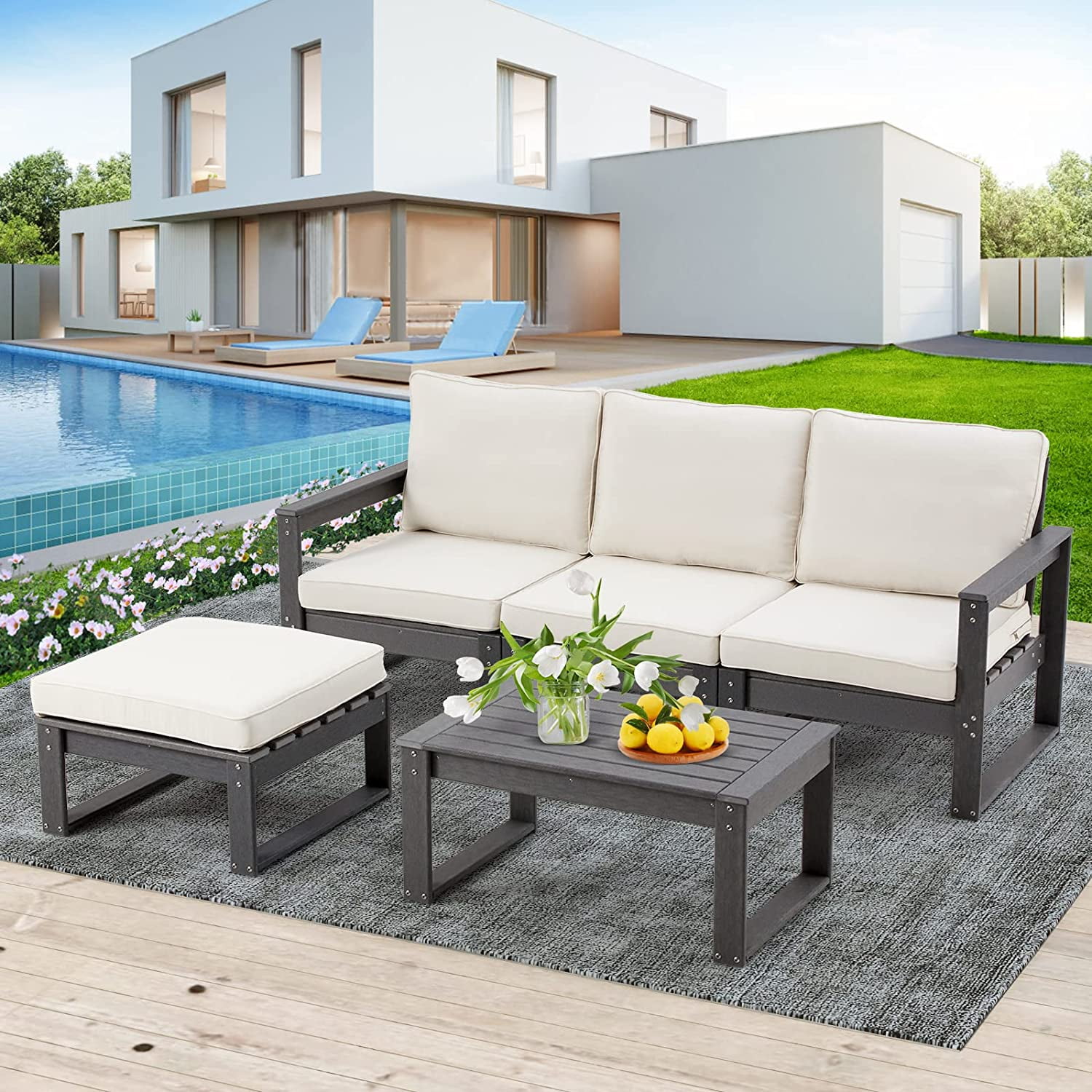 Richryce 3 Piece HDPE Outdoor Patio Sectional Furniture Set with Creamy-White Cushions and Tea Table, Grey