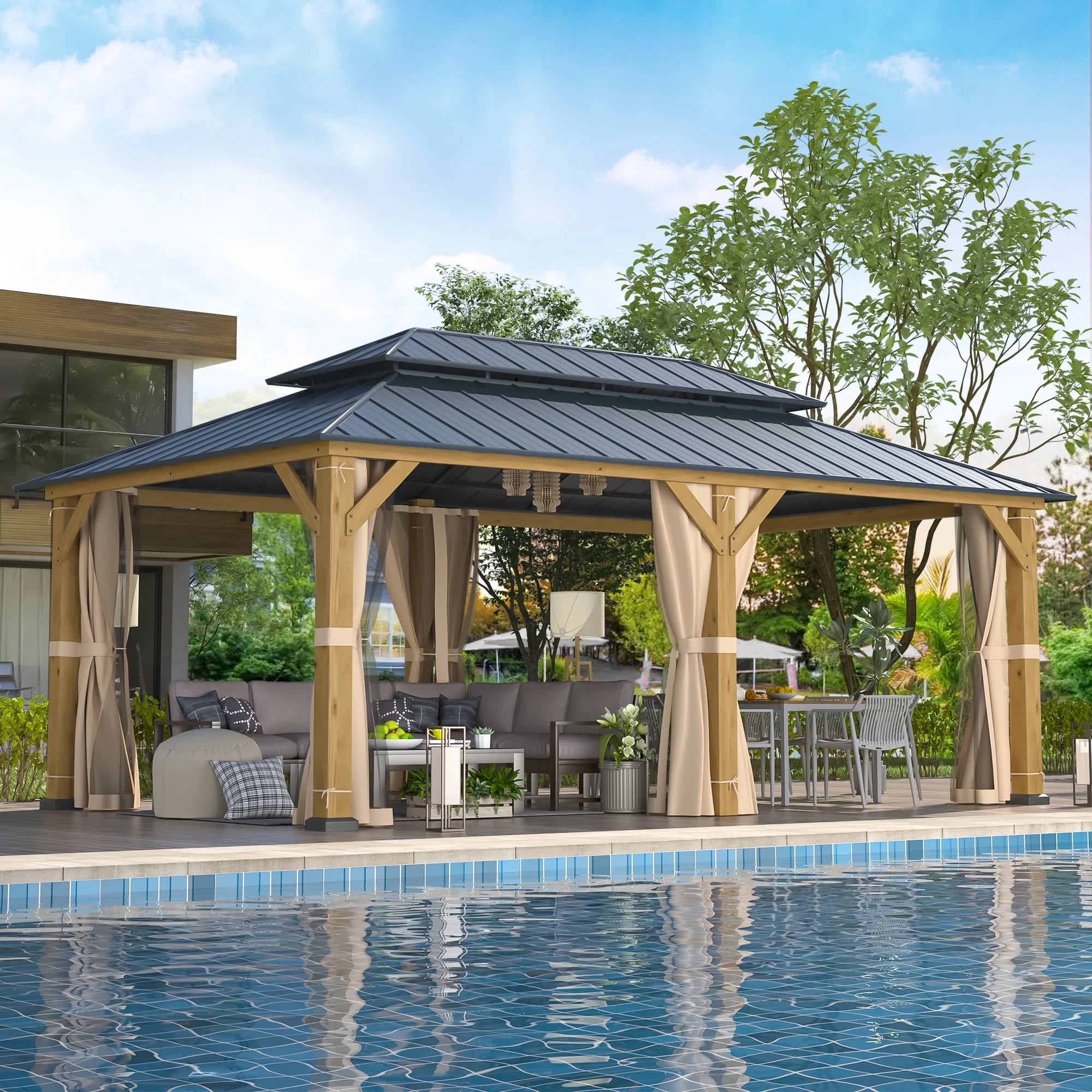 Richryce 14' x 20' Hardtop Gazebo, Wooden Finish Coated Aluminum Frame Canopy with Double Galvanized Steel Roof, Outdoor Permanent Metal Pavilion with Curtains and Nettings for Patio