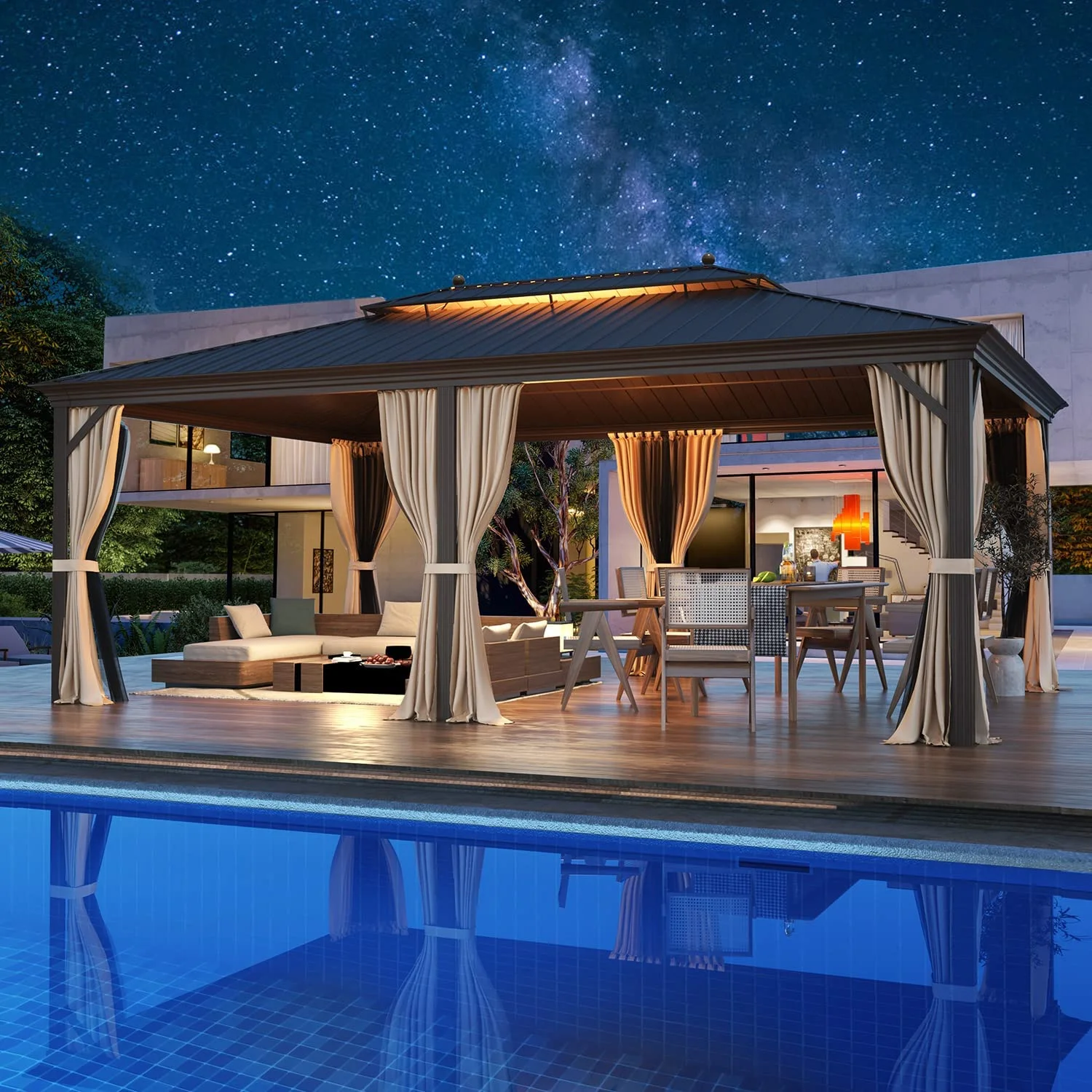 Richryce 14' x 20' Hardtop Gazebo, Galvanized Steel Metal Double Roof Aluminum Gazebos with Curtain and Netting, Brown Permanent Pavilion Gazebo with Aluminum Frame for Patios, Gardens, Lawns