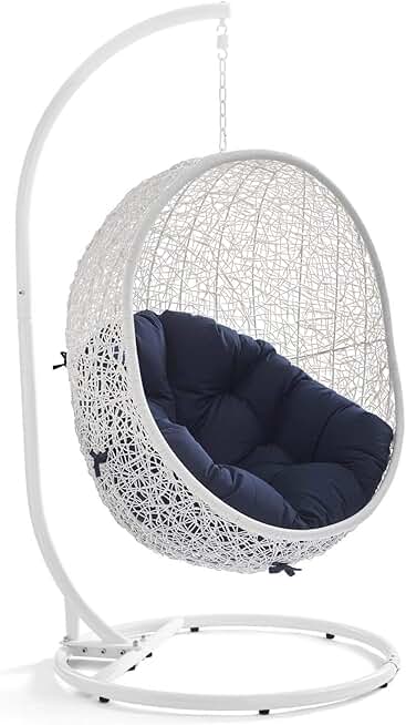 Hide Wicker Rattan Outdoor Patio Porch Lounge Egg Swing Chair Set with Stand in White Navy