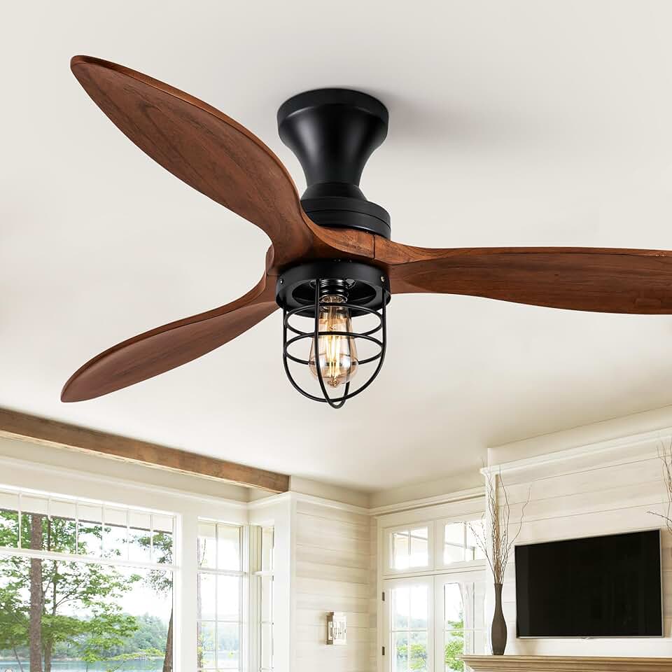 WWM 52 Inch Farmhouse Low Profile Ceiling Fan with Lights, Modern Bedroom Ceiling Fan with Remote 3 Wood Blades Fan Flush Mount Outdoor DC Ceiling Fan for Living Room/Bedroom/Outdoor Patio