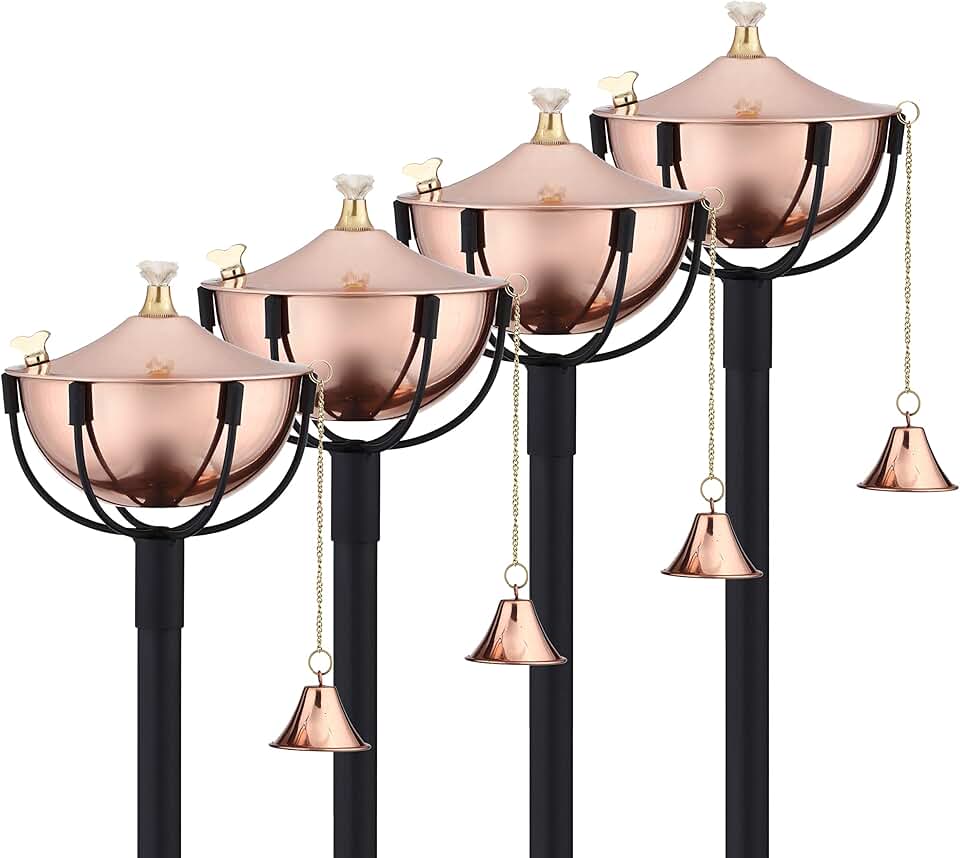 Set of 4, Maui Premium Metal Patio Torches, 54" Tall- Tiki Style/w Snuffer, Fiberglass Wick & Large 32oz Oil Lamp for Deck, Patio, Lawn, Garden, Luau (Smooth Copper)