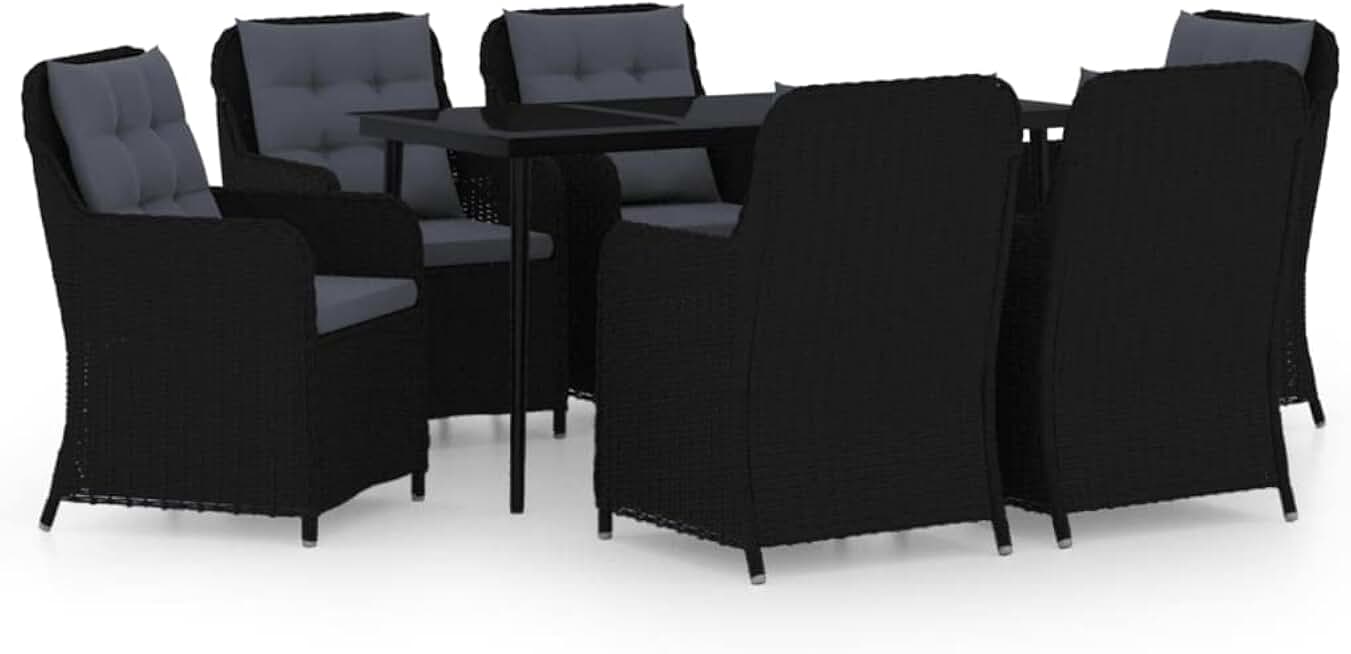vidaXL 7-Piece Black Patio Dining Set - Weather-Resistant PE Rattan Chairs with Cushions, Glass-top Table, Easy to Clean and Maintain, Ideal for Garden, Patio, Outdoor Dining