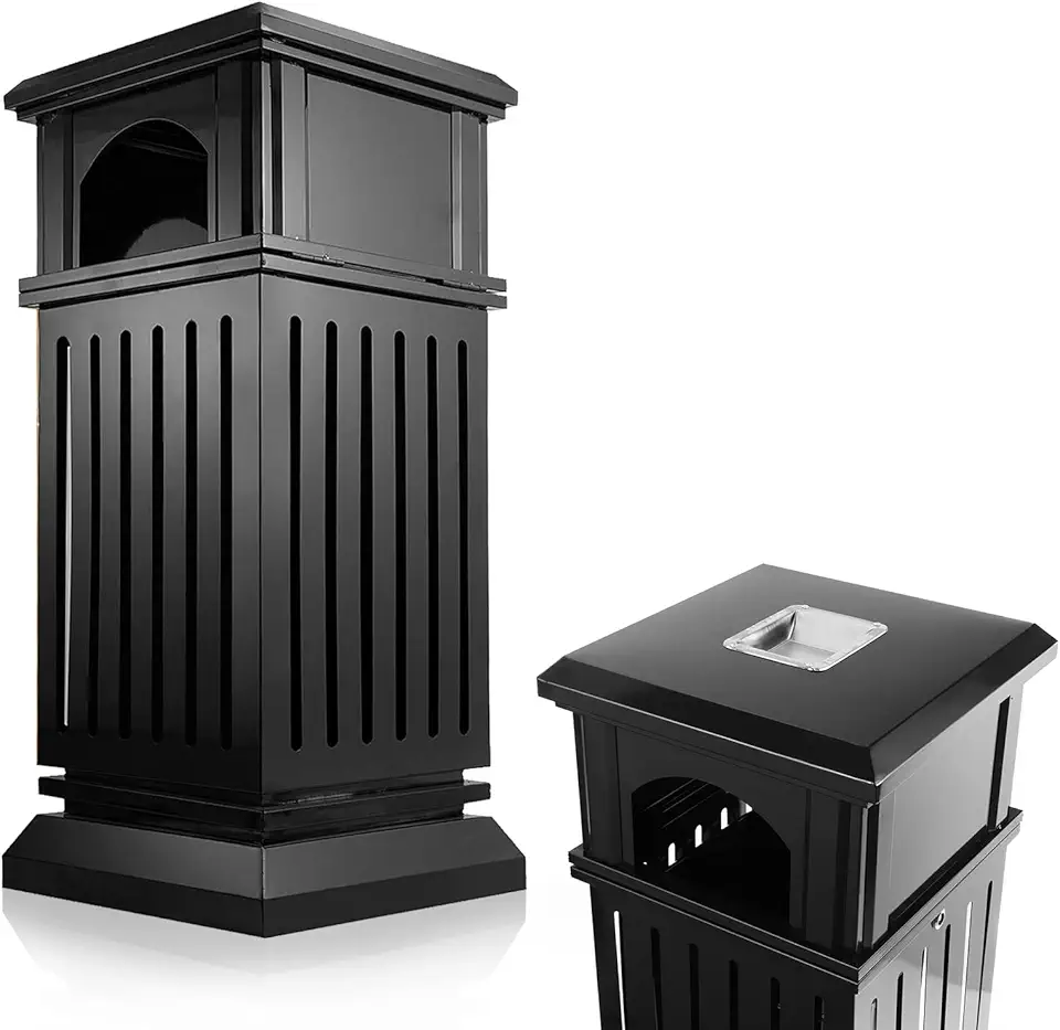 IRONWALLS Commercial Trash Can with Lid, Black Outdoor Garbage Can for Patio, Side Opening Steel Square Commercial Waste Bin, Decorative Trash Container with Removable Inner Bucket for Park, Garden