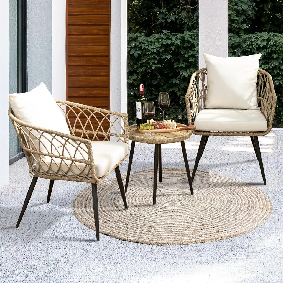 Idzo Pierre 3 Piece Modern Rattan Boho Patio Furniture, Upgraded 2000 Hours UV Resistant Wicker Bistro Set with Premium Olefin Fabric Soft Cushions