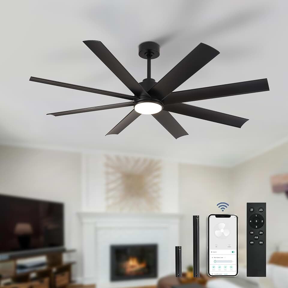 Large Ceiling Fan with Light: 8 Blades Ceiling Fans 60 Inch Remote APP Control 5 Speeds - Black Ceiling Fans for Big Living Room Farmhouse Outdoor Patio