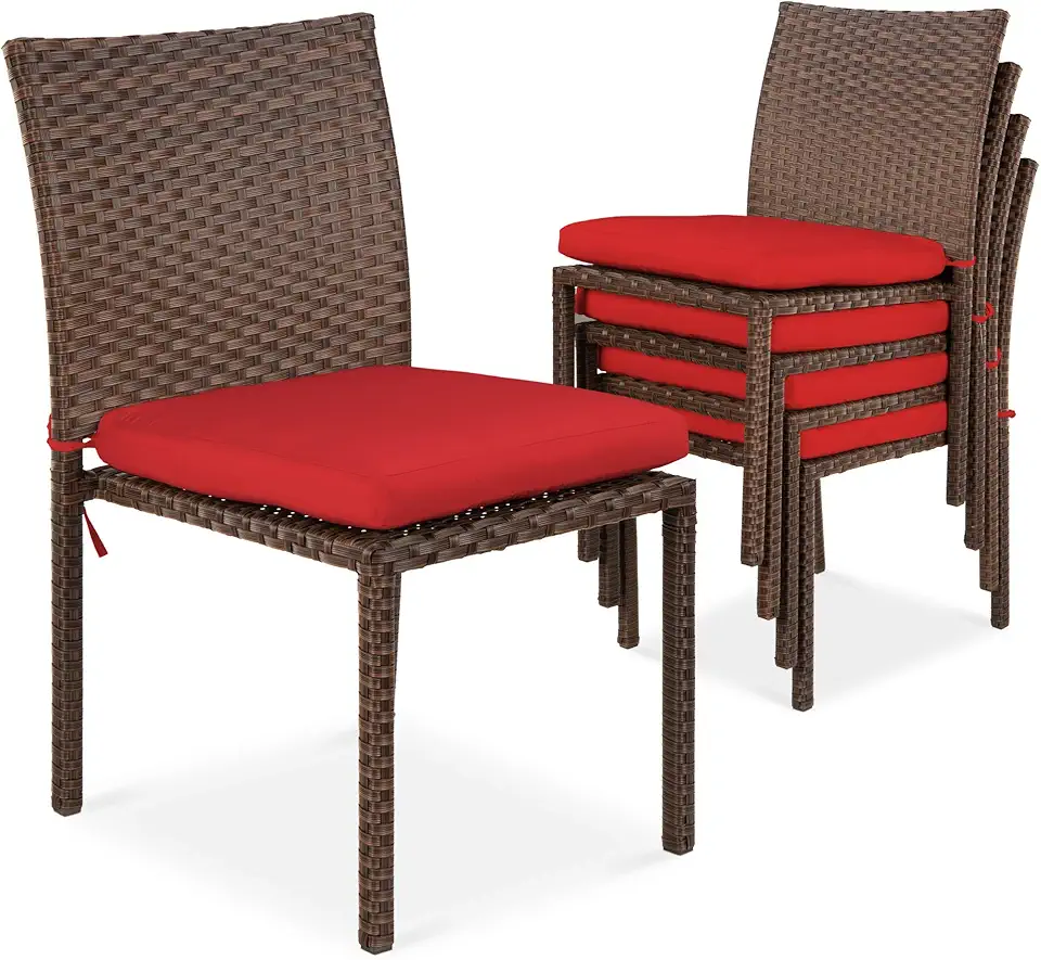 Best Choice Products Set of 4 Stackable Outdoor Patio Wicker Chairs w/Cushions, UV-Resistant Finish, and Steel Frame - Brown/Red