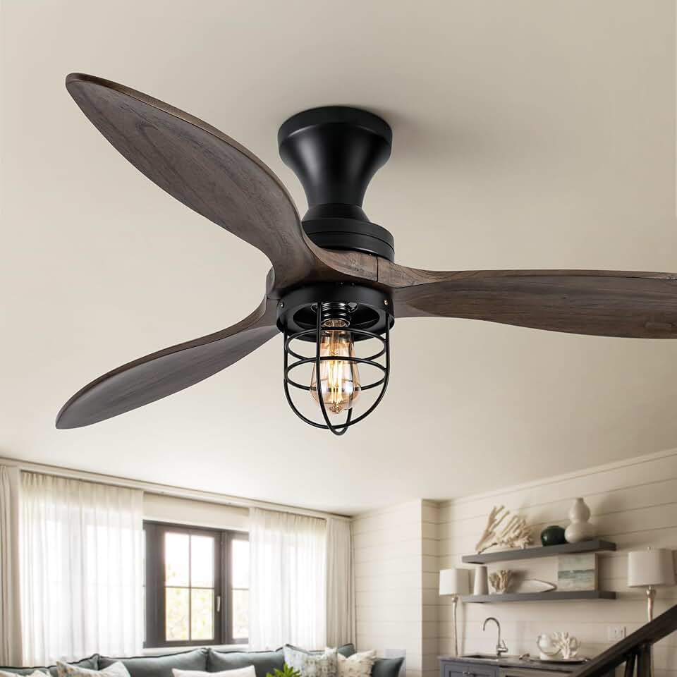 WWM Rustic Flush Mount Ceiling Fan with Lights Remote Control, 52 Inch Low Profile Indoor Ceiling Fans with 3 Wood Blades,6 Speed Quiet Reversible DC Motor for Bedroom,Living Room,Outdoor Patio
