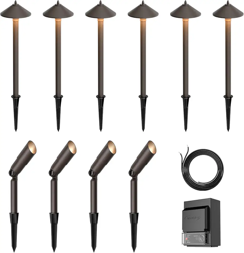 Malibu Landscape Lighting Kit with 150W Low Voltage Outdoor Transformer & 12V Halogen 6PK 10W Bronze Pathway Lights & 4PK Metal 20W Flooding Lights/Spotlights Warm White & 75Feet #16 Wire for Patio
