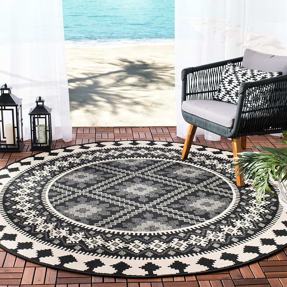 SAFAVIEH Veranda Collection 9' Round Black / Cream VER099 Boho Indoor/ Outdoor Non-Shedding Easy Cleaning Patio Backyard Porch Deck Mudroom Area Rug