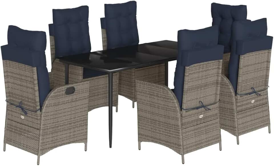 vidaXL 7-Piece Patio Dining Set - Gray Poly Rattan, Powder-Coated Steel Frame, Adjustable Recliners, Navy Cushions, Tempered Glass Tabletop