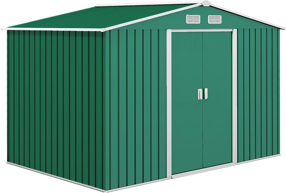 Outsunny 9.1'x 6.4' x 6.3' Garden Storage Shed w/Steel Floor Foundation Outdoor Patio Yard Metal Tool Storage House w/Double Doors Green