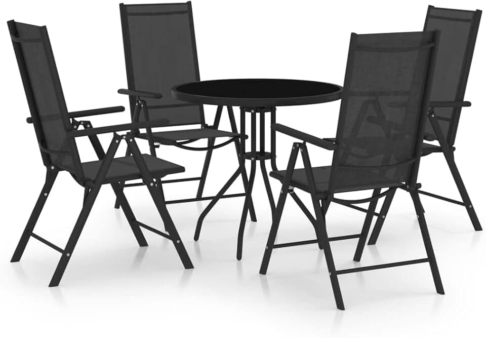 vidaXL 5-Piece Outdoor Patio Dining Set with Adjustable Armchairs, Glass Tabletop, Textilene Seats and Backrests, Powder-Coated Aluminum Frame, Space Saving Design - Black