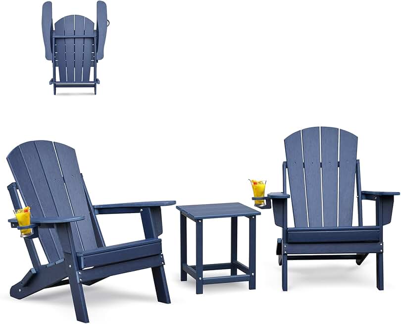 ATR ART TO REAL Folding Adirondack Chairs Set of 2 with Table, HDPE Weather Resistant Outdoor Firepit Chairs with Cup Holder, Patio Folding Chairs for Garden, Backyard,Deck, Fire Pit(Navy Blue)