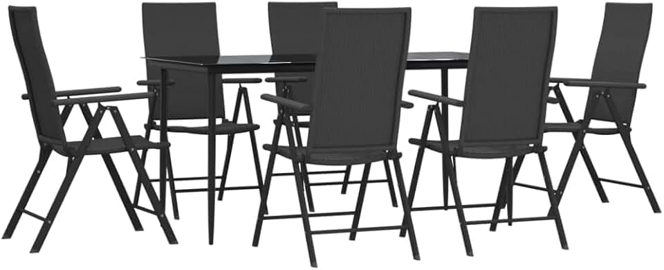 vidaXL Patio Dining Set - 7 Piece Black Poly Rattan, Weather-Resistant, Adjustable Reclining Chairs with Foldable Design, Powder-Coated Steel Frame, Tempered Glass Table, Outdoor/Garden/Deck Use