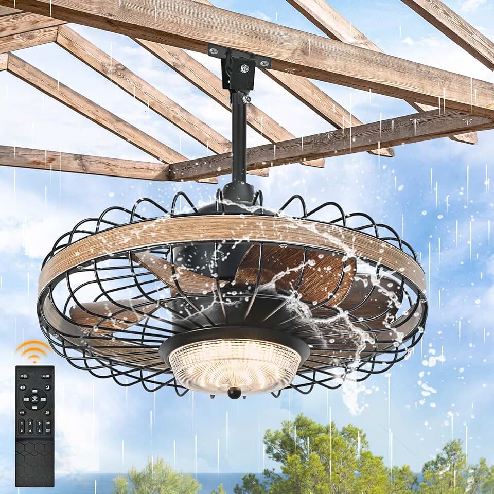 Outdoor Gazebo Ceiling Fans with Light for Patios Waterproof Hanging Ceiling Fan with Smart Remote&APP Control Outside 21Inch LED Cage Fan Dimmable Lights Farmhouse for Pergola Porch Ork Wood+Black
