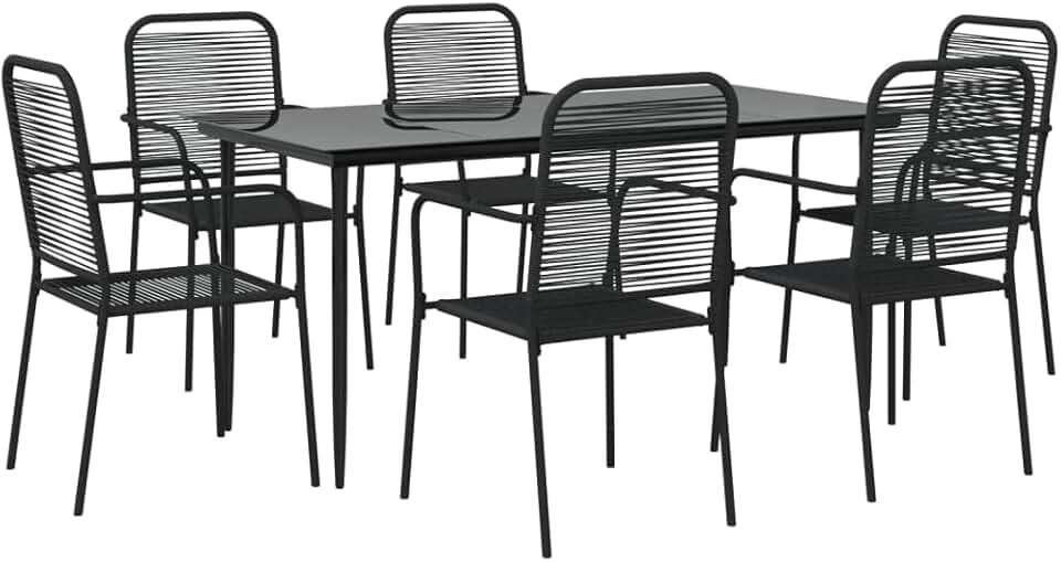 vidaXL 7-Piece Patio Dining Set, Outdoor Furniture, Powder-Coated Steel Frame with Glass Tabletop and Black Cotton Rope Chairs - Ideal for Garden, Patio, Terrace, Kitchen, and Dining Rooms